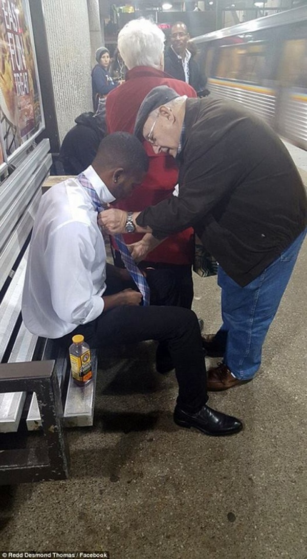 Пожилой джентльмен учит молодого человека завязывать галстук