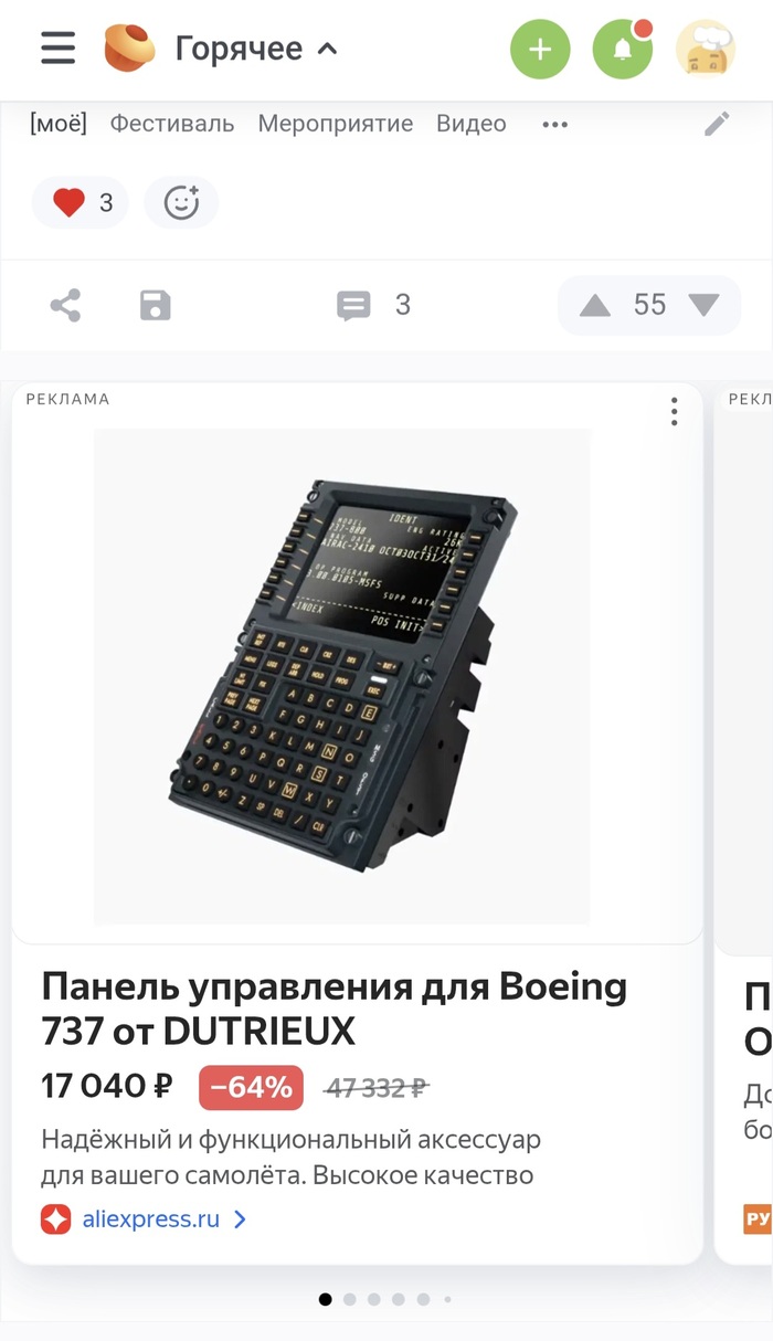 1 NRtfm Алиэкспресс удивляет 2 месяца назад Такого у меня ещё не было. Реклама на Пикабу предлагает чуть ли не бортовой компьютер от Б737, и недорого! Показать полностью 1 Картинка с текстом Картинки 1 Ещё 0