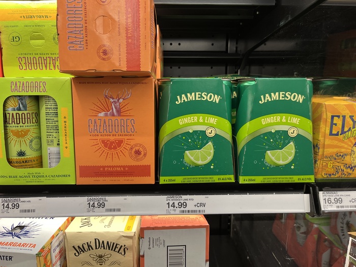 Очень много "коктелей", в роде замешенного джин тоника или бакарди с колой. Самый популярный джек с колой без сахара, 4 банки по 0,5 - стоят в районе 10$ (крепость в районе 10%).