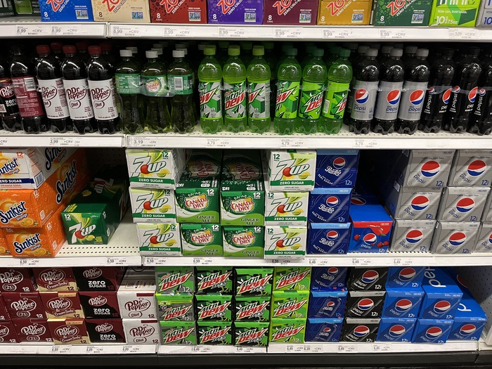 Газировку тут ОЧЕНЬ любят, по наблюдениям берут именно большими пачками, где штук 12-20 бутылок по 0,33. Мой фаворит тут это доктор пеппер зиро)