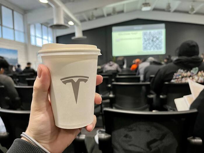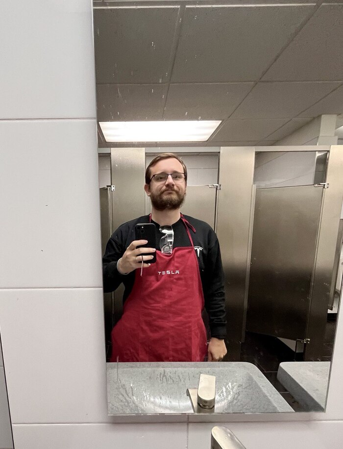 Решил что подожду, внутри встретил мужчину который со мной был на интервью и ждал того же теста, разговорились - зовут Адам, больше 7 лет служил в армии США, шел на менеджерскую должность в тесле, но политика компании, что сначала нужно отработать 3 месяца на базовой позиции. Адам ждал с 10 часов утра и очень сильно ругался. Выглядит он очень стереотипно, комбез цвета хаки, что то типо берцев, татуировки огня на руках.