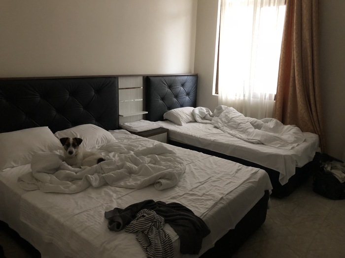 В такой дождь ехать по горным дорогам мало приятно, но чем ближе мы приближались к морю - тем дорога все больше выпрямлялась. И вот в третьем часу ночи мы наконец то добрались до апартаментов и заселились. Первым, все прелести мягкой кровати оценил Вульф.