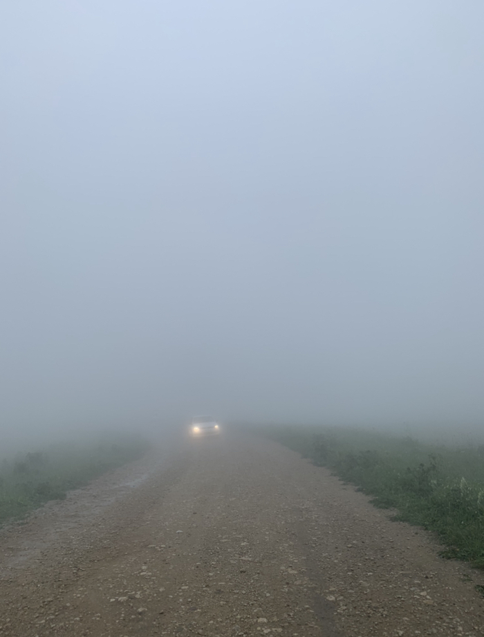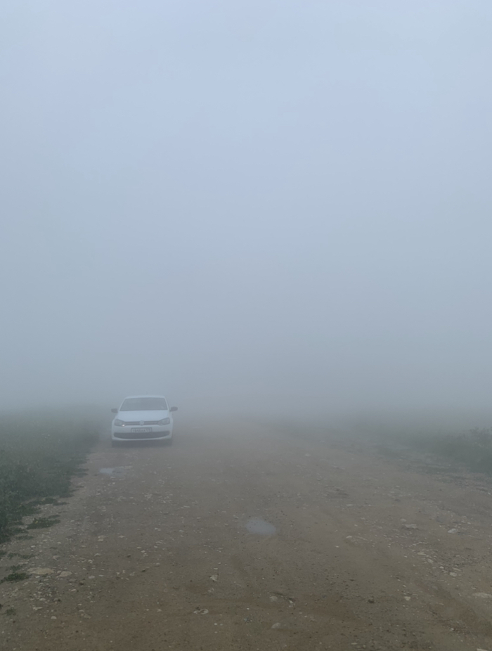 Но взвесив все за и против - приняли решение отступить. Машина действительно очень тяжелая, уже на гравийной дороге мы начинали пробуксовывать, а учитывая предстоящий съезд на колею идущую по полю - шансы таяли на глазах. Так же очень сильно напрягал туман, который моментально окутал нас и мы не особо понимали где нужный нам съезд. Так или иначе, мы повернули назад и начали медленно но верно спускаться обратно к селу.