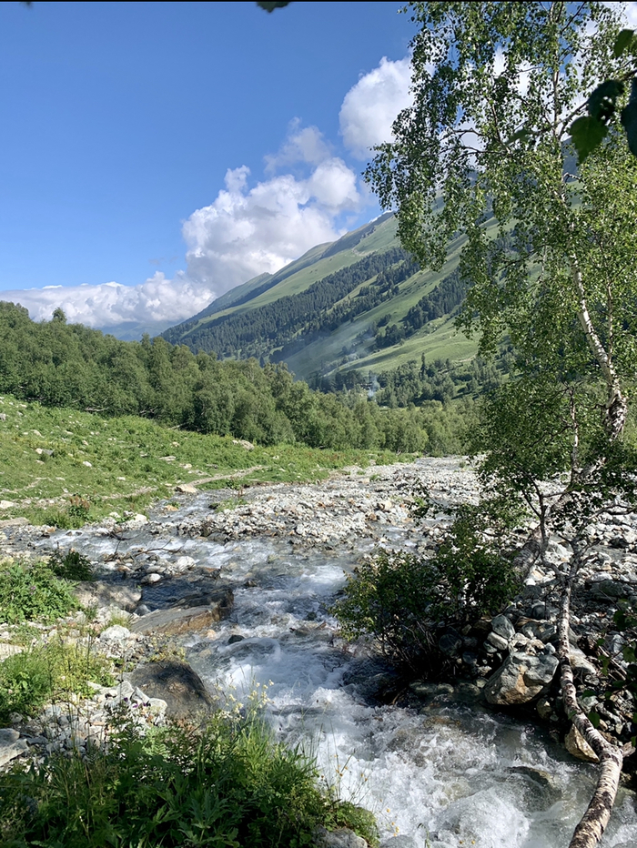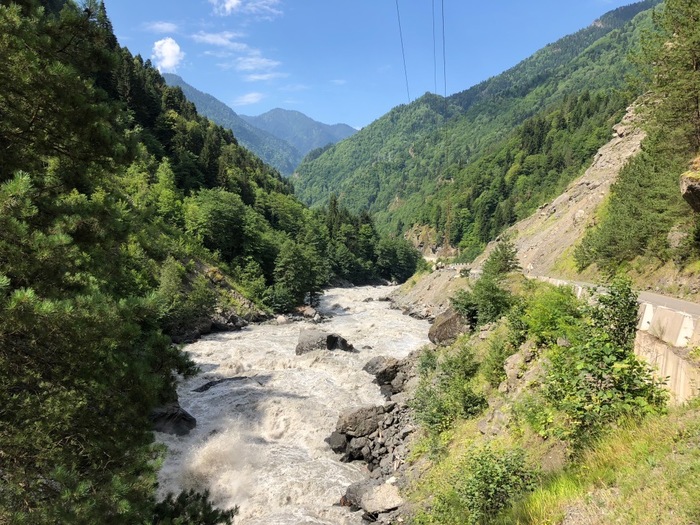 Дорога идет вдоль Ингури, очень красочной реки. Протекает она через Грузию и Абхазию, длинной 213 Км. Вода в ней голубая, словно в карибском море. У нее много порогов и водопадов на всем пути, есть крайне бурные экземпляры.