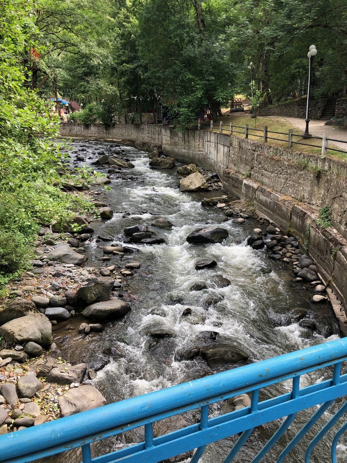 Дальше мы выдвинулись в Боржоми. Город известен, как не трудно догадаться, своей минеральной водой и курортами расположеными в нем. Город совсем небольшой, на текущий момент в нем проживает примерно 15 тысяч. Город окружен горами со всех сторон, очень красиво. Цель визита была довольно очевидная, попить минеральной воды прямо из источника и погулять по парку с одноименным названием, больше здесь заняться решительно нечем. Но изначально, на подъезде к баржоми мы остановились отобедать, это было как всегда очень вкусно - мы взяли форель, шашлыка разного, картошки и пару литров вина с собой, за все заплатили в районе 2000 р. Так же было очень круто кушать на свежем воздухе, рядом с бурной рекой, в окружении гор.