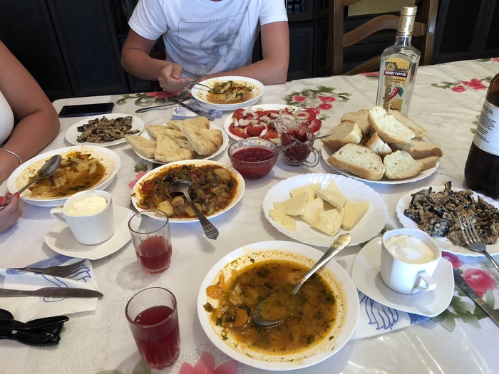 Разумеется вино, домашнее. По факту - алкогольный компот, вкусный :) Очень много продуктов из молока, разные сыры, сливки и т.д. Грибы делаются тоже в сливках, как и кабочки. Очень-очень много домашнего сыра, пирожки с творогом и сырники. Очень много овощей. Ну и разумеется чача. Так как по факту кушали мы вместе, это их основной рацион, мясо едят не часто в основном употребляется то, что выращивают и делают сами здесь. И сделано это не из-за экономии, семья далеко не бедная. В доме висит огромный ЖК телек, дюймов на 55-60, у всего семейства не модные телефоны от самсунга, новая машина. Я сделал вывод, что это их обычный рацион, тем ценнее был этот ужин. Пить пиво, есть шашлык с хинкали к тому моменту начало поднадоедать.