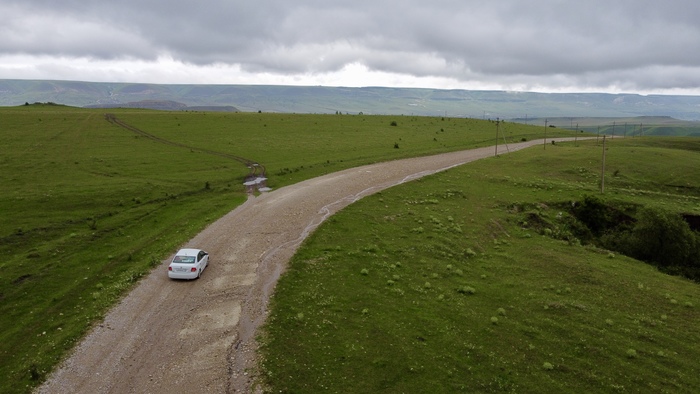 Ехать из Чегемского ущелья до села Учкекена (место старта на плато) примерно 200 км - 3-4 часа пролетели не заметно, мы добрались довольно оперативно. Никто из нас не было на плато и точную дорогу мы не знали, у нас были только подсказки надерганные из сети - заметок более опытных путешественников и скриншоты из немногочисленных роликов с YouTube. Нам нужно было попасть на гравийную дорогу которая шла из села по направлению к плато - из ориентиров были только столбы ЛЭП вдоль нее. Как не странно, на месте оказалось довольно много указателей (видимо местные жители порядком устали от бесконечных вопросов), в итоге мы попали на нужную нам дорогу.