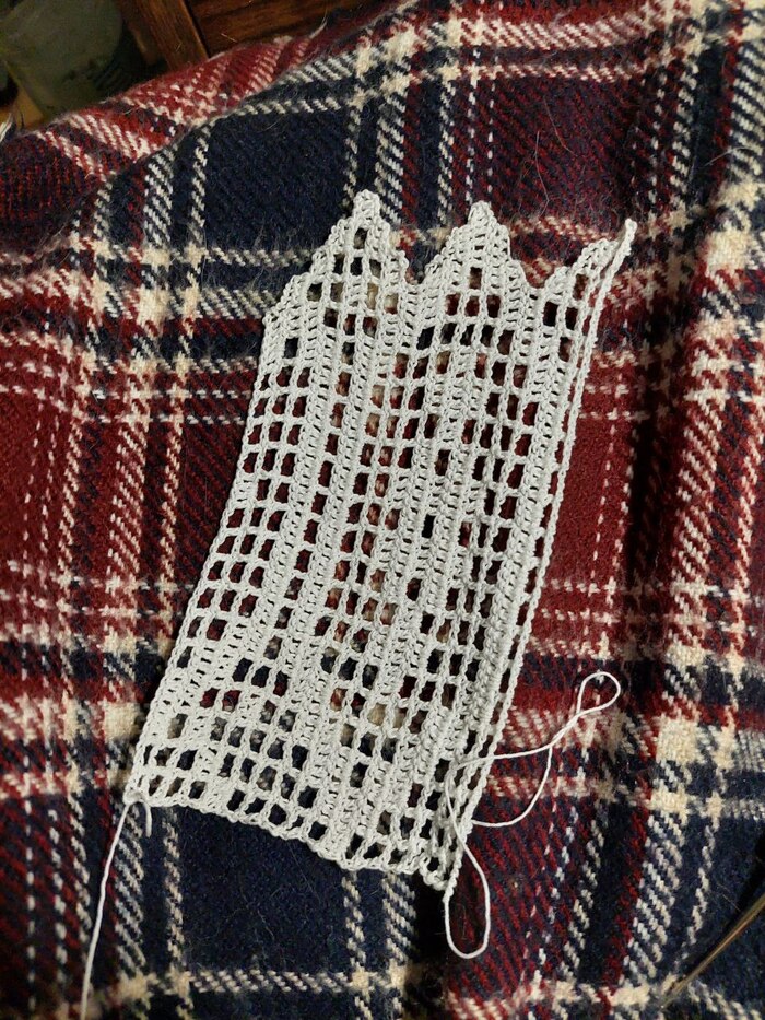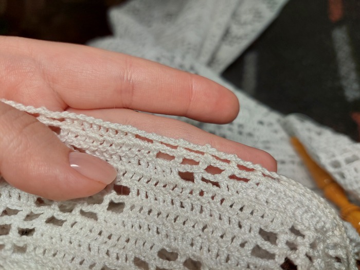 Примерка показала, что "чего-то не хватает" и я решила добавить оторочку из вязанного кружева. Поскольку я, конечно, псих, но не настолько, кружево решено было взять готовое.