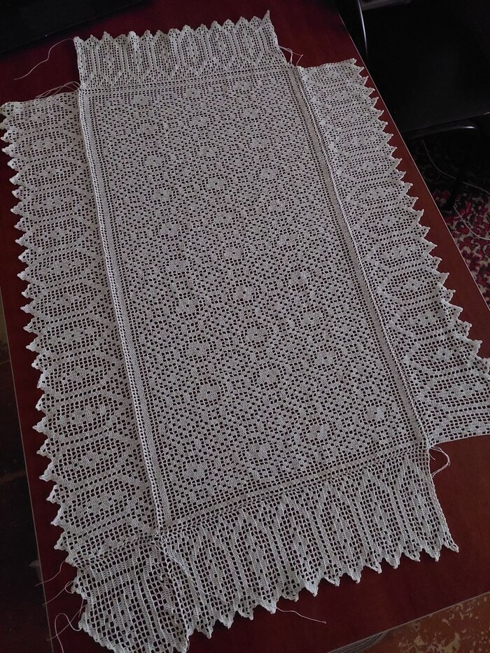 Когда основной прямоугольник закончен - приступила к подзорам. И тут я поняла, что я - не самый умный человек. Но я себя успокаиваю тем, что я не знала, как это делать. В общем: логичнее всего вязать скатерть единым полотном с подзорами по длинной стороне. Потом быстро провязать две короткие стороны и уголки. Но нет, я начала всё вязать отдельно. Мне кажется, что подзоры я вязала столько же, сколько и основное полотно.