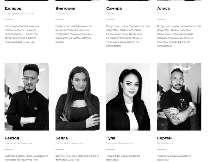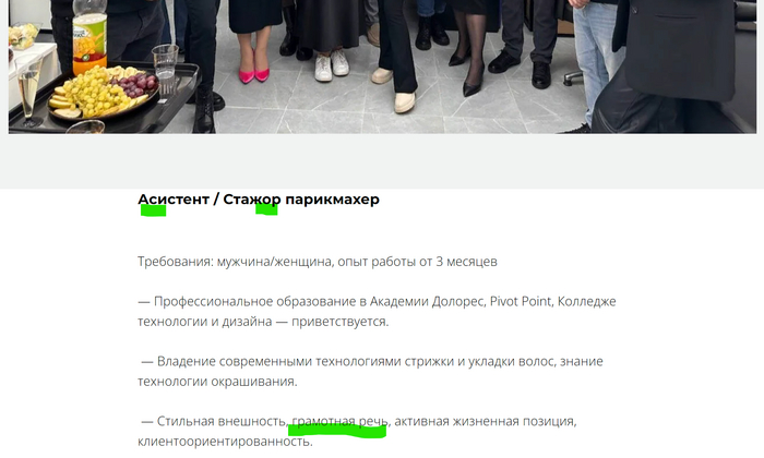 На первый взгляд, всё хорошо. На сайте есть прайс, с примерно средней+ температурой по городу. Есть выбор и фотки мастеров, вроде всё норм. Даже Дилшода с Бекзодом можно простить, потому что есть ещё Виктория и Алиса и даже, не побоюсь этого слова, Сергей. Все вон выпускники академий и школ. Выглядит круто. Но, опускаемся ниже, до вакансий, и сразу видим, что русский язык им явно не родной.