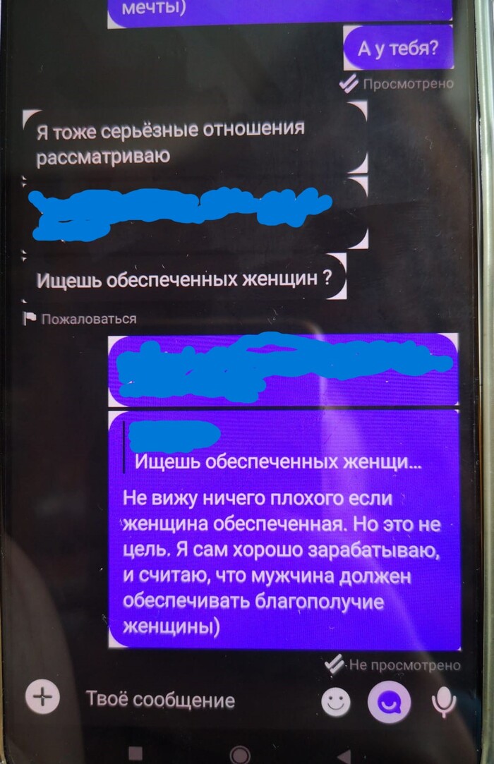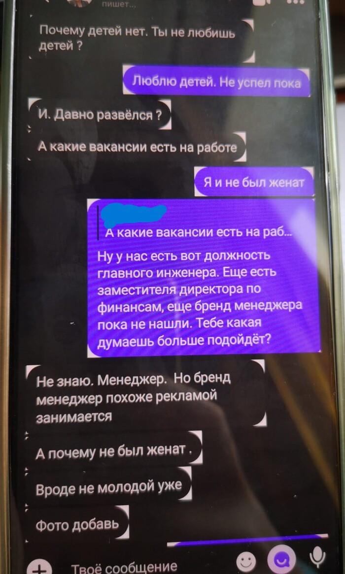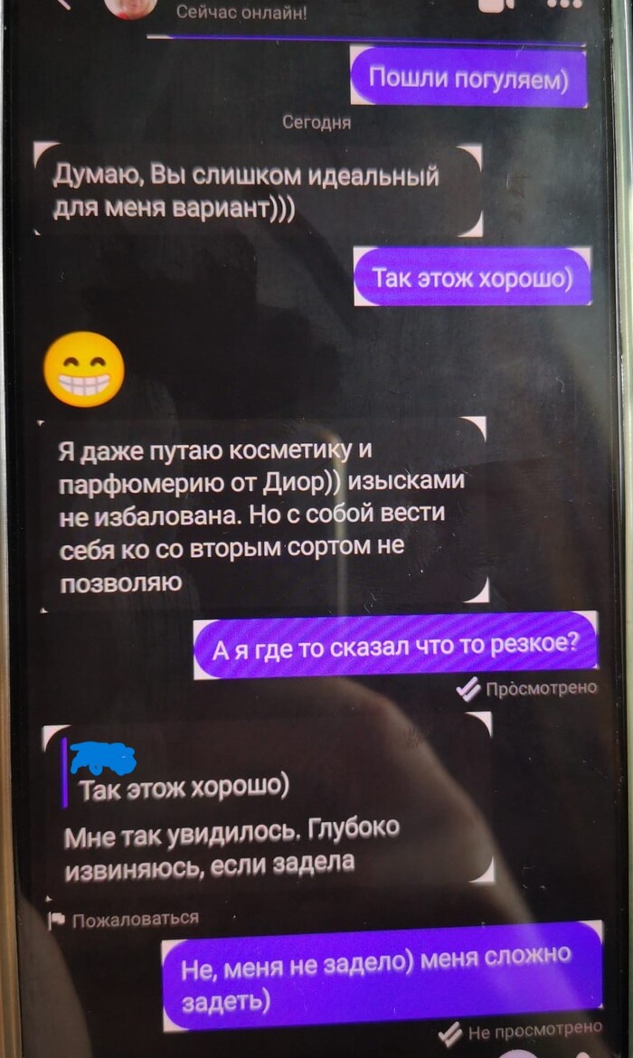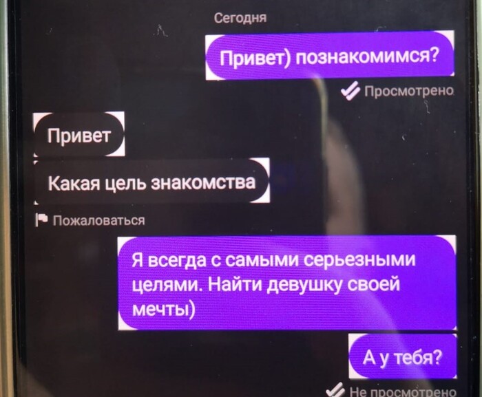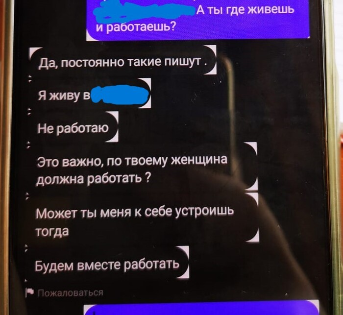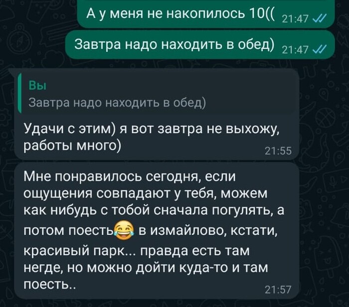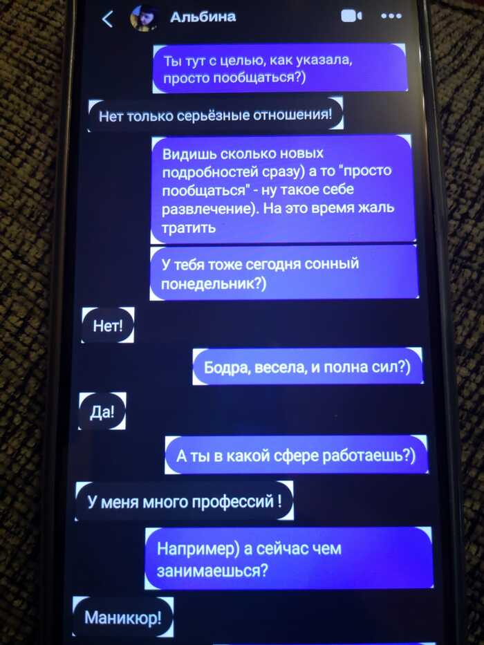 Далее мадам понимает, что ухватила удачу за хвост. И резко берёт дело в свои руки. Требует мой телефон и номер, созвониться. Во-первых, я не могу говорить, т.к. сижу на онлайн совещании, и прям сейчас неудобно. А в том, что она позвонит сразу, я не сомневался. Во-вторых, я не собираюсь давать ей свой телефон) мне, с её настойчивостью потом придётся сжечь симку). Мягко сливаю, что пока не время для телефонных разговоров. Тут меня отвлекают по работе, включаюсь в митинг, параллельно отмечаю что там подряд летят кучи сообщений с разницей в минуту. В конце, как оказалось, мы (она) уже успели поссориться и она написала мне отвалить)