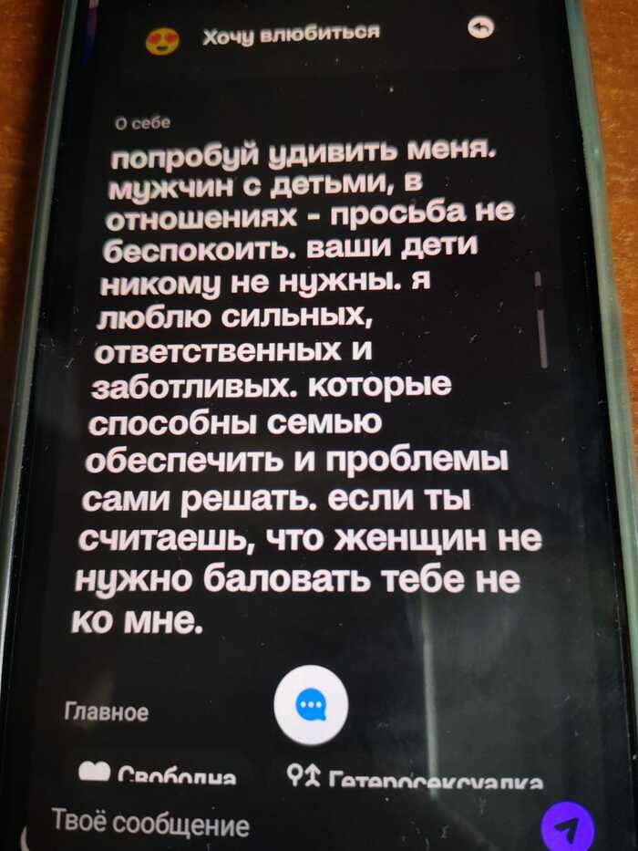 Далее мы видим, что у девушки высокие запросы. Она любит, чтобы её удивляли. Заботились о ней, обеспечивали, баловали. На этом этапе меня начинает вгонять в комплексы. Я уже ощущаю, что я недостоин. Но решаю, что потом соберусь с силами и сделаю всё, чтобы она была счастлива. Судя по описанию, такая девушка этого достойна. К тому же детей у меня нет, так что шанс есть.