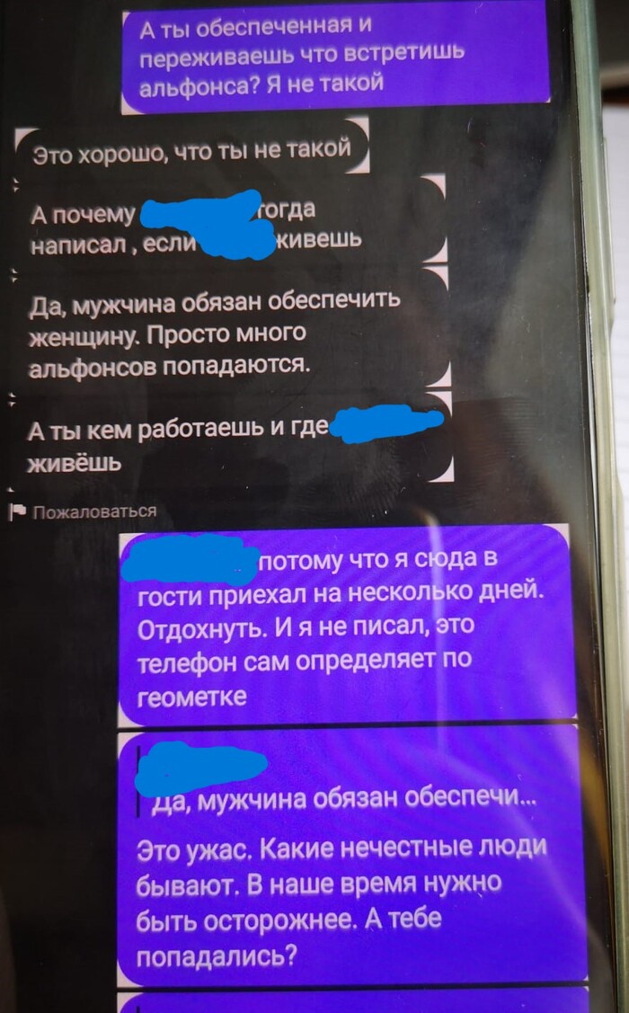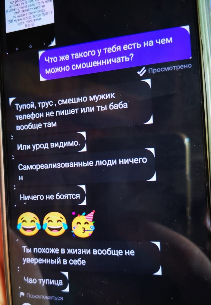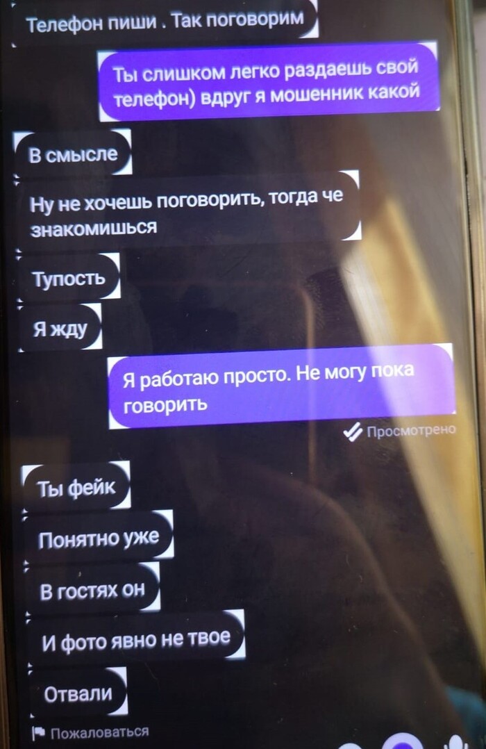 Вот так, твердо и четко, меня определили в немолодого альфонса, мошенника, фейка, с не своим фото (своим), тупого, нереализованного труса, и неуверенного в себе тупицу. На ровном месте).