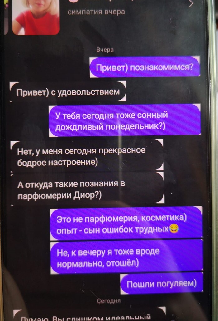 Подходит. Здороваемся. Предлагаю прогуляться. Подавляю в себе желание сквозануть в образовавшийся проход, в приоткрытую дверь в метро. Идём, разговариваем. Я, в большинстве случаев, вежливый и тактичный человек. Не сторонник каких-то ссор или скандалов. Поэтому максимально мягко интересуюсь - а твои ли это фотки, красавица? Нет, - молвило чудовище). - Тогда почему ты поставила их в свою анкету? Ответ у меня четко отпечатался в голове, и я помню его до сих пор - "А мне сказали, что я на неё похожа!" 🤦♂️🤦♂️🤦♂️. Ага, похожа. Примерно как корова на газель. Тоже парнокопытные.