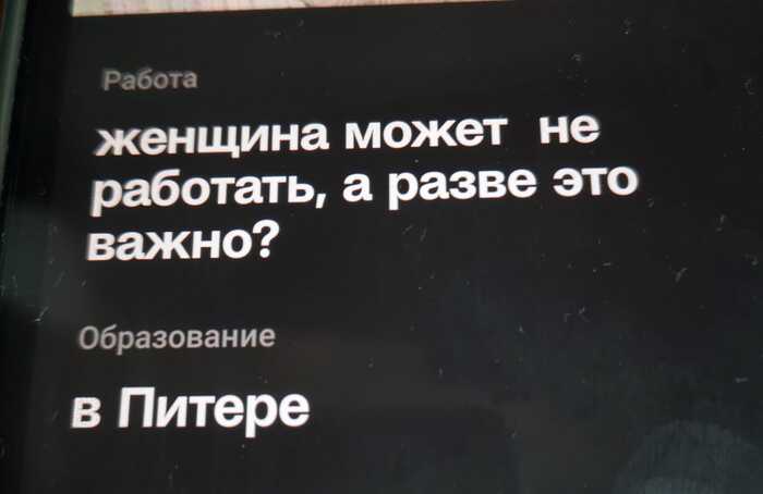 Периодически путешествую по просторам нашей необъятной, и останавливаюсь в каком-нибудь усть-пиздюйске. В тиндере там своя, особая атмосфера. Если в Москве девушки помешаны на идее "мой мужчина должен за всё платить" (сколько раз я слышал и видел эту фразу... блять, найти бы того худрука, который им это преподаёт), то в пердях, с населением несколько десятков тысяч человек, у женщин преобладает синдром "последней пизды в поле". Это означает полную оторванность от реальности, и гиперболизацию своих запросов, при отсутствии сколь-нибудь внятного предложения. Молодые и интересные девушки давно разъехались из таких мест в столицы, адекватная конкуренция отсутствует. Что означает, что можно творить любую дичь, и всё равно при этом оставаться богиней. Ничего хорошего и интересного там не найти, я пытался. Но скоротать время вечерами, за перепиской, можно. Всё равно там больше делать нехуй - социальная жизнь прекращается в 7-8 вечера, вероятность познакомиться с дамой на улице или в ресторане стремиться к нулю (последний ресторан закрылся в 90-е).