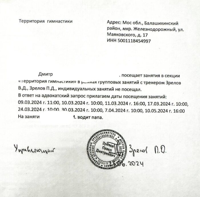Я сделала адвокатский запрос и поручила Наташе его отвезти в фитнес-клуб. Поскольку данных о тренере характеристика не содержала, а была подписана исключительно управляющим Топориным С. А., в запросе я попросила направить в мой адрес сведения о тренерах, занимающихся с Димой индивидуально и в рамках групповых занятий, расписание тренировок, а также указать даты и время уже посещенных тренировок.