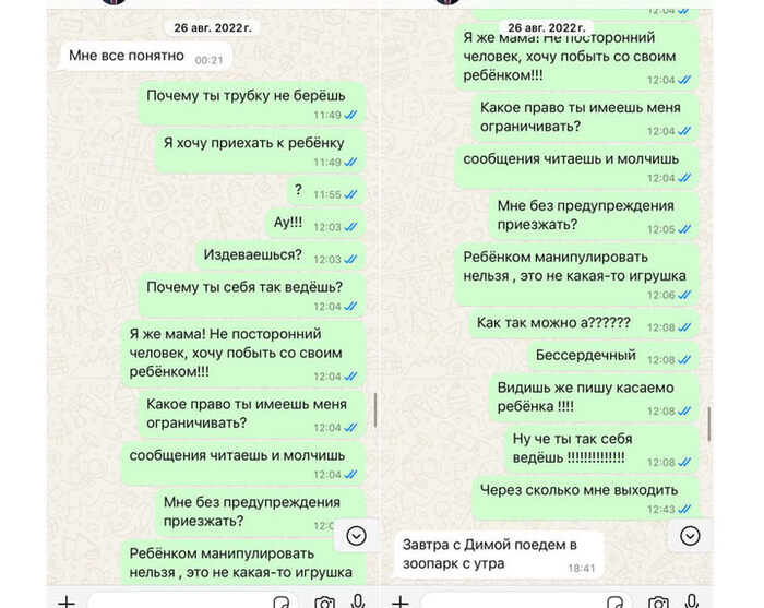 Лена: Как вы объясните, вашу переписку с Наташей, 26 августа, 22-й год, то есть по идее, на следующий день после того, как вы с ней обо всем договорились, и она пообещала вам, что все будет хорошо, почему она 20 сообщений просит вас о встрече с ребенком?