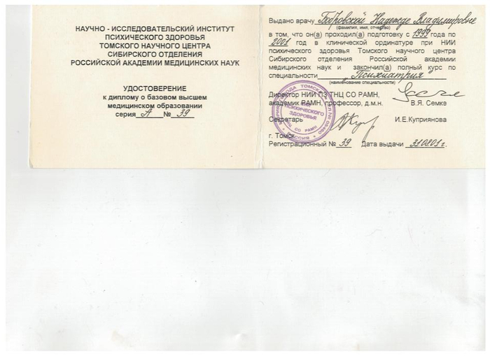 По этой причине , после окончания института (тогда уже университета) в 1999 году поступила в ординатуру по психиатрии, которую проходила в Томском НИИ Психического здоровья.