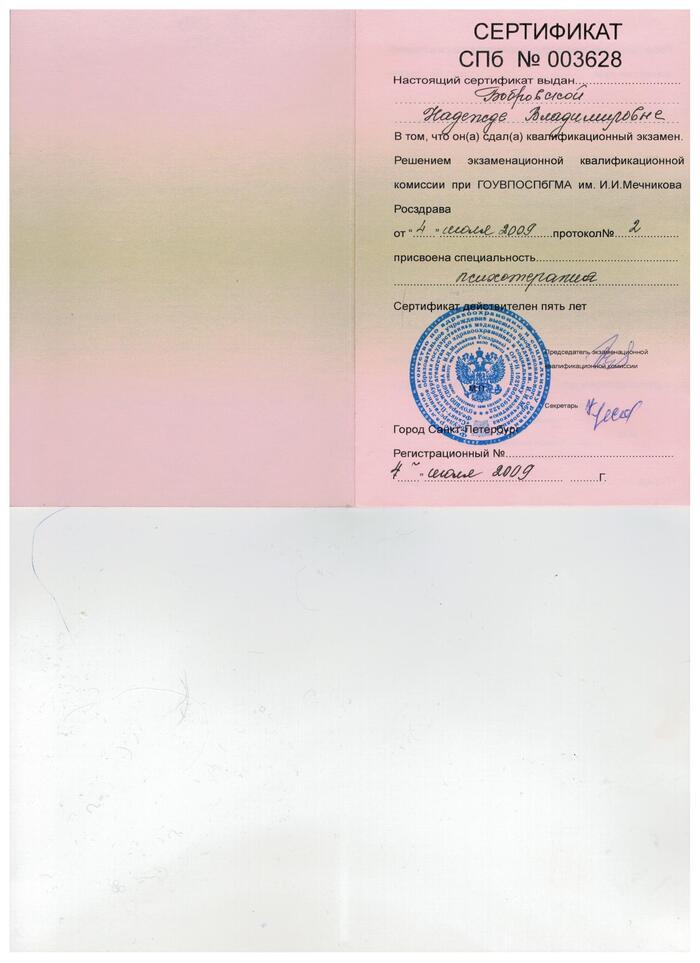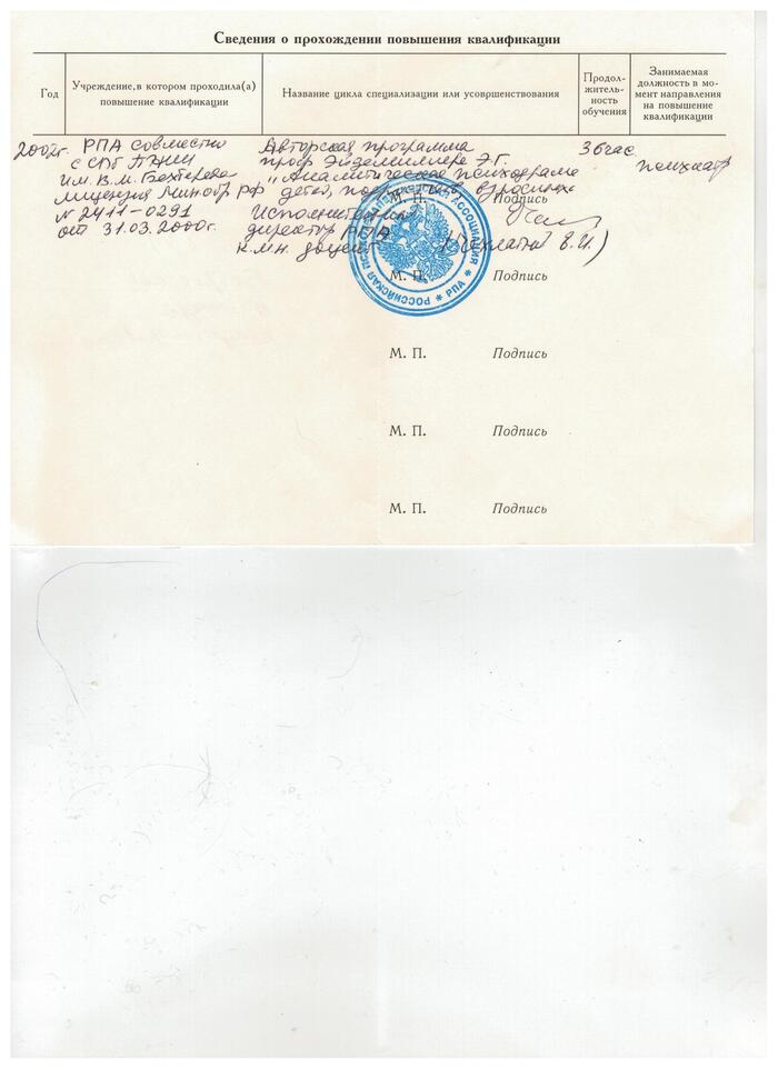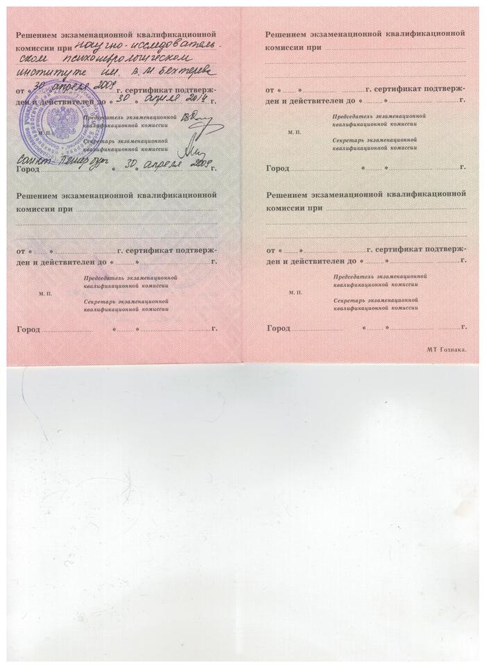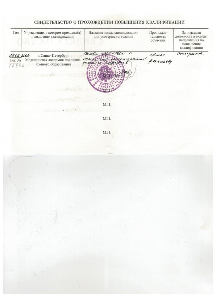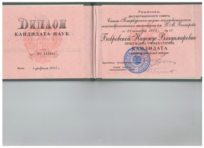 Далее была аспирантура в НИИ им. В.М. Бехтерева, г. Санкт -Петербург, защита кандидатской диссертации по теме "Критерии прогноза у пациентов шизофренического спектра".