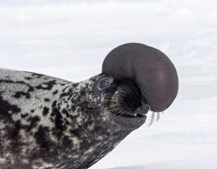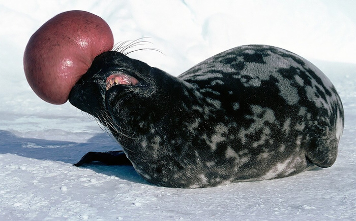 1. Нет, пузыри из жвачки эти тюлени не выдувают. Здоровенный красный пузырь, торчащий из носа – это часть самого тюленя, причудливый выкрутас полового отбора.