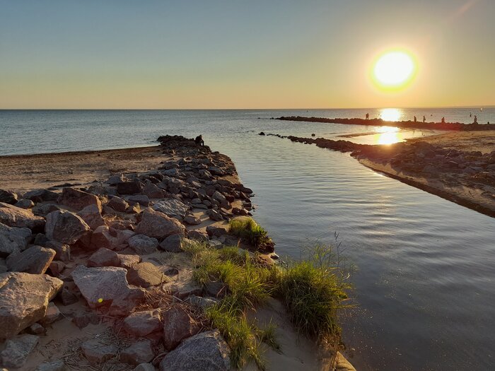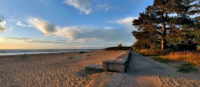 Пока полуденное солнце не раскалило песок, ступать по нему легко и приятно. Отдыхающих почти нет, только несколько шерстяных питомцев выгуливают своих хозяев, да ЗОЖ-ники занимаются утренним променадом: бег, скандинавская ходьба, велосипед. Идиллия.