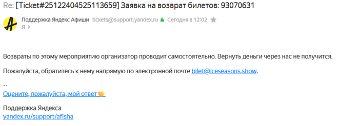 Я покупал билеты через Афишу Яндекс, считая это надежной организацией, но я ошибся, т.к. они отказываются возвращать деньги за отмененное шоу, а предлагают обращаться на прямую к организатору, который по сути всех кинул и похоже является мошенником.