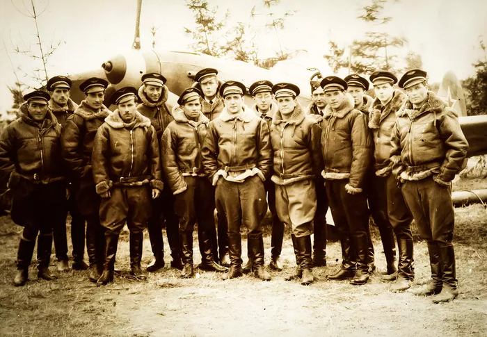 Группа пилотов полка "Нормандия-Неман" (Ролан де ля Пуап второй справа). За время боев на Восточном фронте летчики части совершили 5240 боевых вылетов, провели около 900 воздушных боев, в которых одержали 273 подтвержденные победы. Потери "Нормандии" – 42 человека из 96