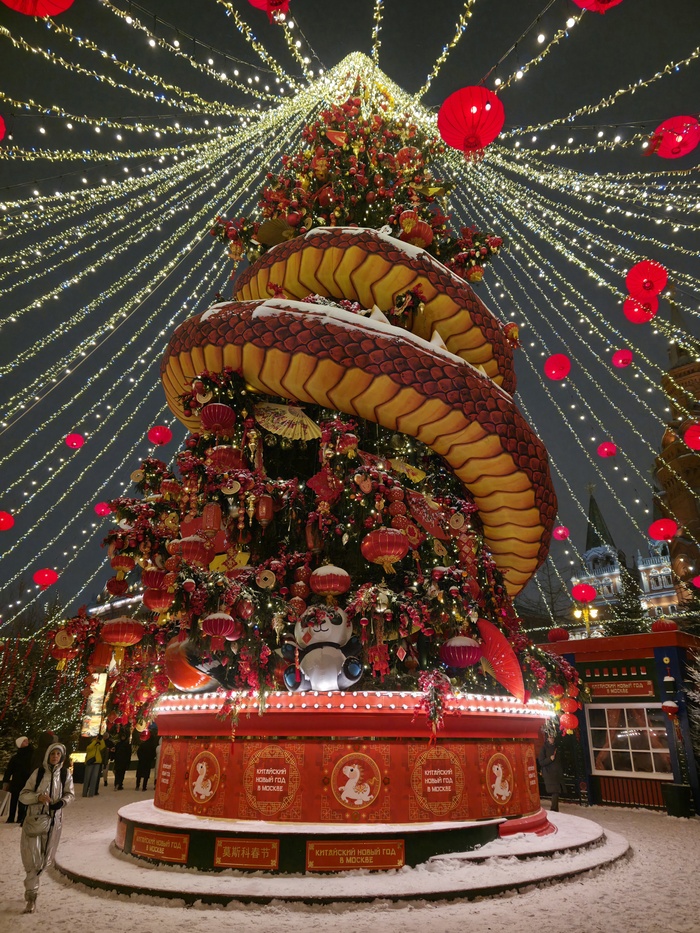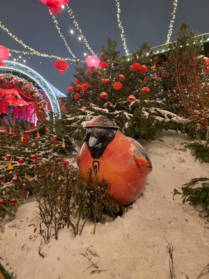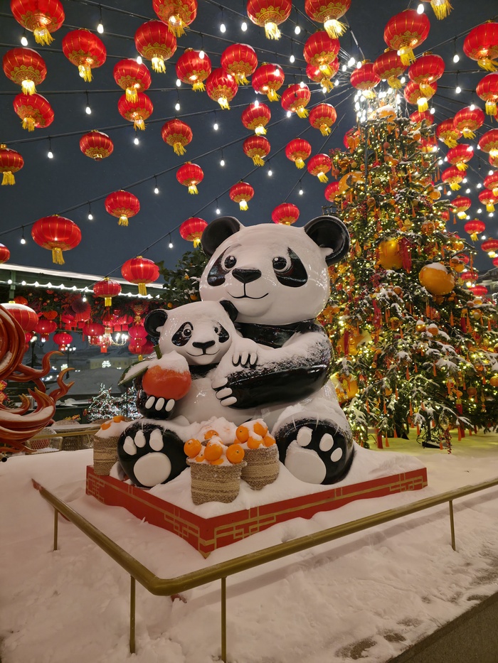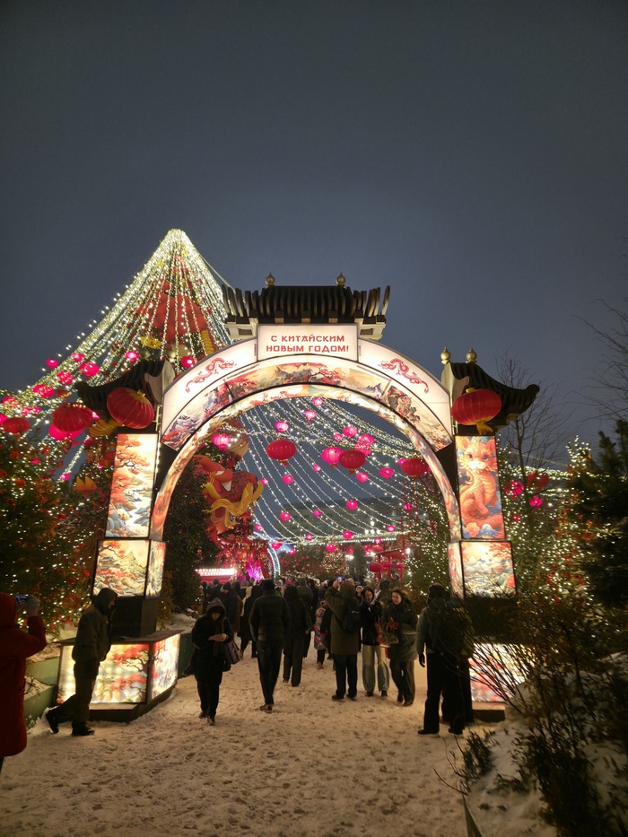 Праздничное настроение создают панды, красные огненные лошади, драконы, снегири, триумфальные ворота и море красных фонариков 🏮 Повсюду звучит китайская музыка — атмосфера просто невероятная! 🎼