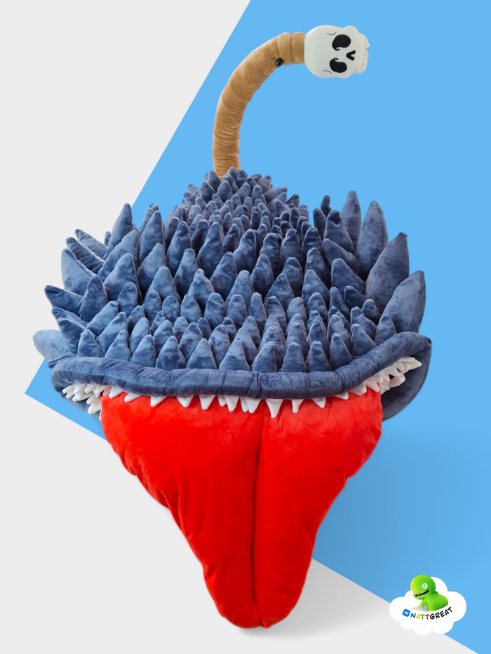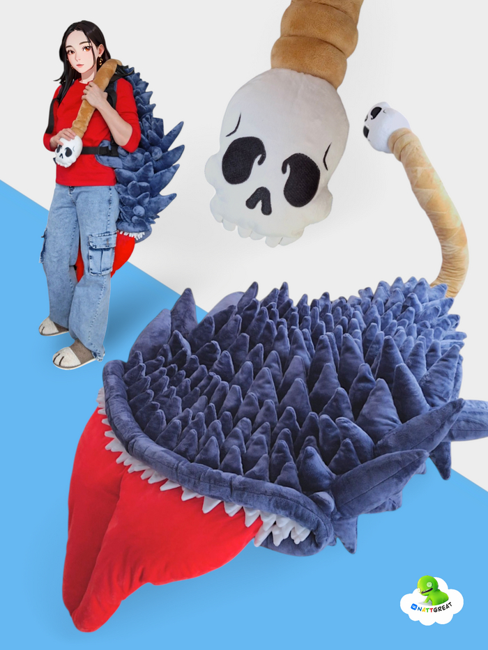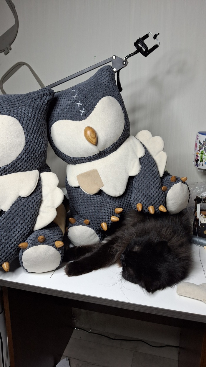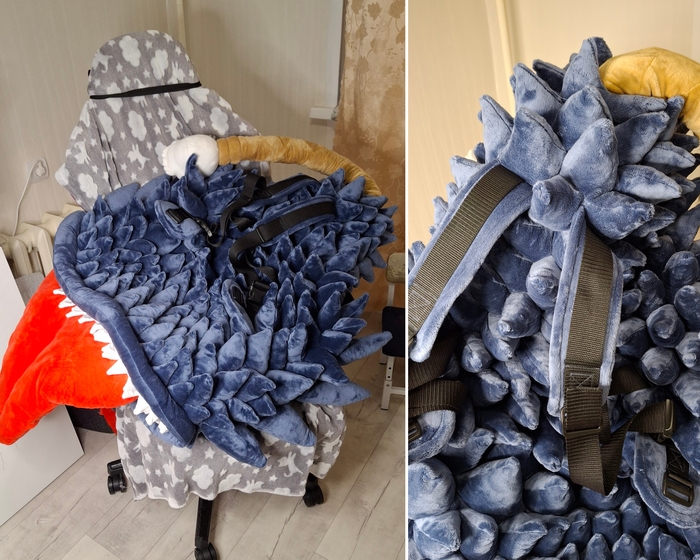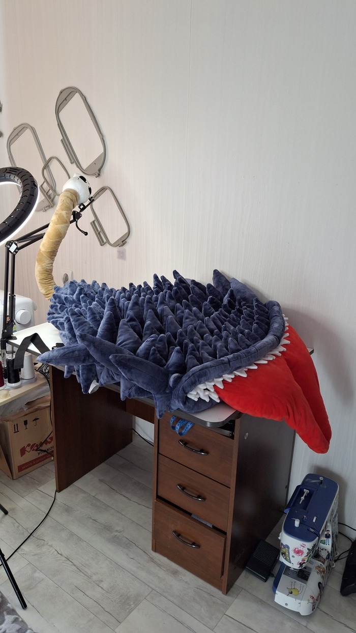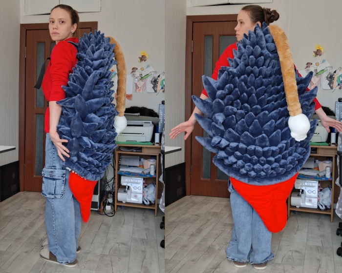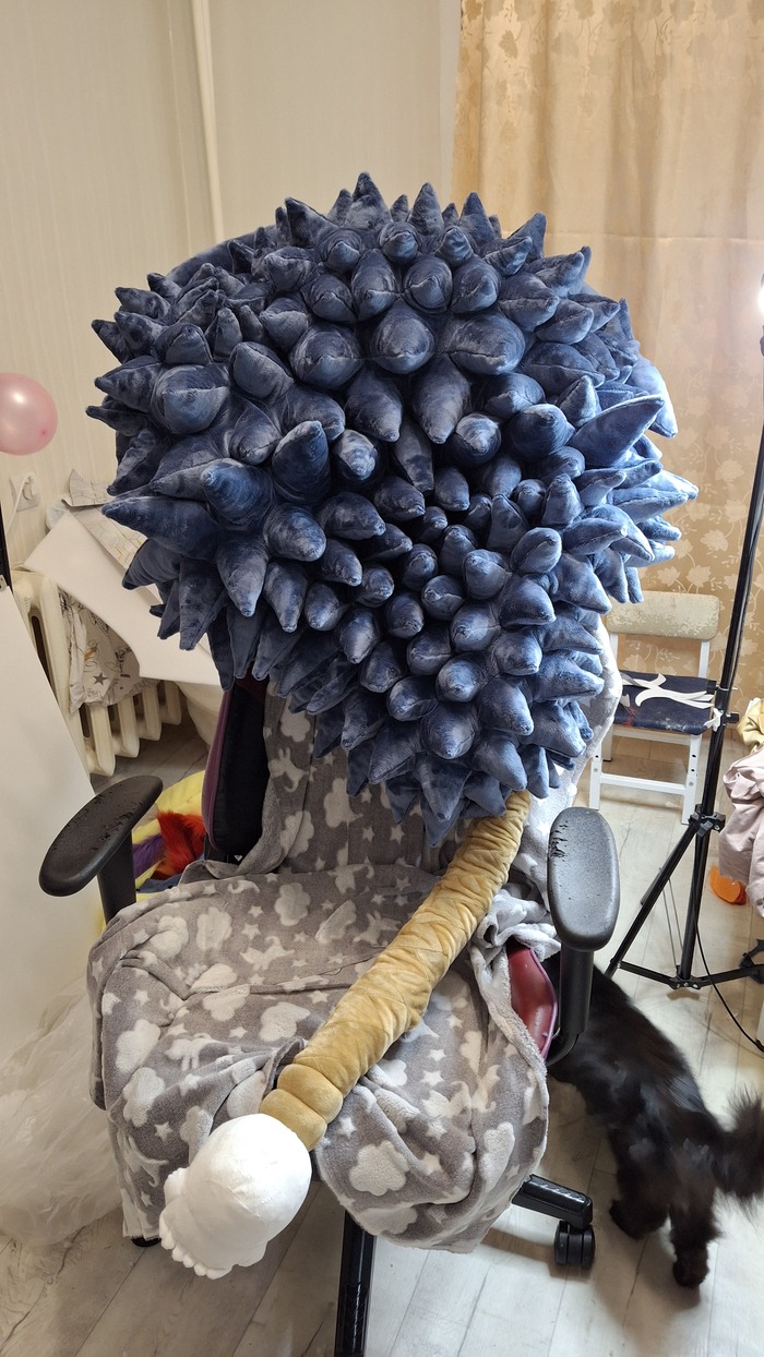 Выяснилась проблема. Наполнитель выпадает из шипов внутрь тушки. Шипы выворачиваюся и остаются пустыми. Если игрушку набить польностью проблема исчезнет. Самехада будет толстой и красивой. Но огромной, на спине не удержится. А должна.