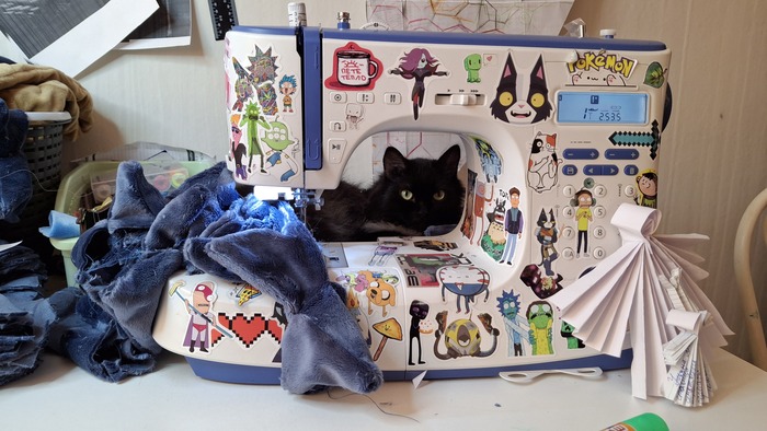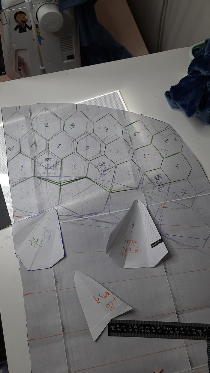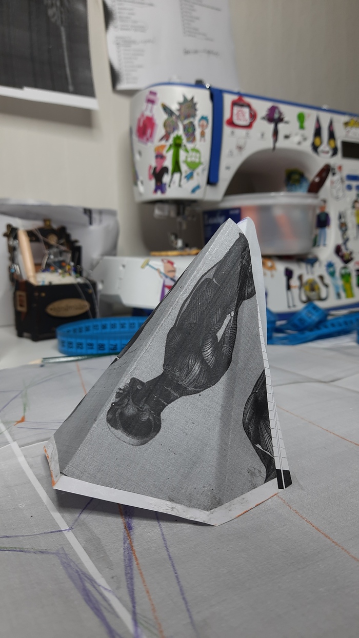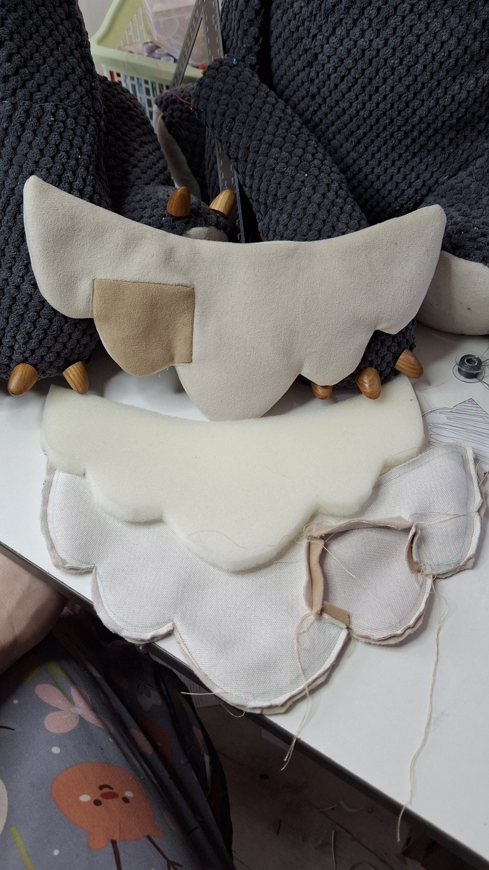 Но я побоялась, что рисунок на стыках швов не совпадёт и получится не очень ;n; Сделали их машинной строчкой. Чертиоа на деталях ручкой, потом прошивала.