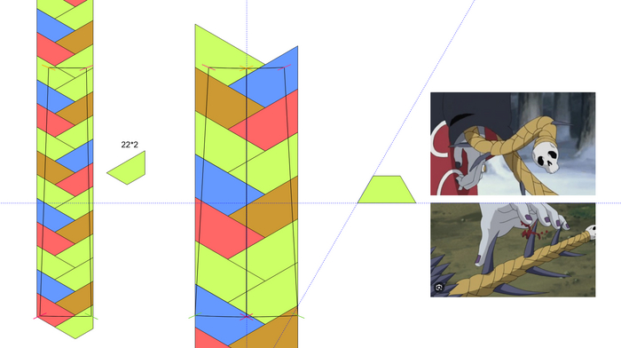 В некоторых рядах были пятиугольники. Верхняя часть идёт с игибом в виде дуги. Шипы постепенно сходятся к центру. Чтобы их развернуть делала большие пятиугольные основания пирамид.