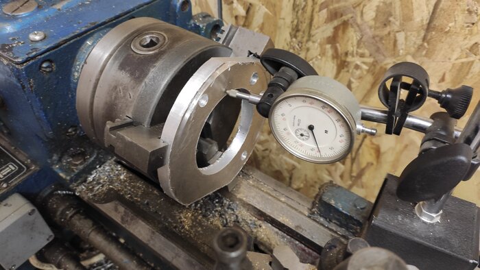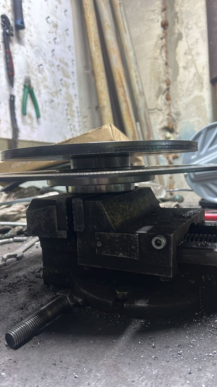 Самое большое кольцо, некий адаптер, через который крепиться щит с колодками, изготовил из алюминия д16т, это хороший крепкий материал, позиционируется как авиационный, но по факту применяется много где, даже в силовых частях легких спортивных автомобилей. В связи с этим думаю ручник не отвалится))) Плюс он отлично обрабатывается, просто одно удовольствие с ним работать. Вырезал на чпу с припуском 0.5мм на сторону внутреннего и наружного радиусов. После обработал на токарном станке, чтобы точно вывести все размеры по чертежу, и убрать следы фрезеровки. Очень важно точно с позиционировать эту шайбу в кулачках патрона, чтобы не было осевого биения, иначе прилегающие плоскости не будут параллельны, что приведет не правильной установки щита с колодками относительно барабана. Так что берем микрометр и обкатываемся.