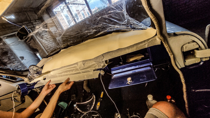 Материал использовал, какой-то автомобильный кожзам, выбрал наиболее подходящий по оттенку. В качестве мягкой подложки использовал шумоизоляцию 3мм, такая вспененная, серого цвета. Выбрал ее из-за того, что она твёрже чем подложка поролона, в связи с этим все примыкания холдингов очень чёткие, комбинация приборов встаёт как бы в свой ложемент, ну это конечно при условии хорошей и четкой подрезки. Сверху уже наклеивал кожзам на клей спрей 3м 77. Кожзам по месту подрезал.