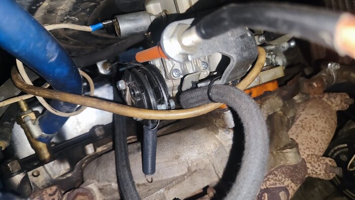 Еще нужно было синхронизировать тросик кикдауна с карбюратором, купил полумесяц и поставил его наоборот, к полумесяцу на котором натянут трос педали газа. Карбюратор солекс.