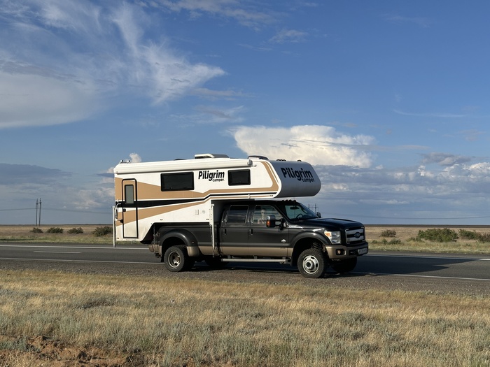 Итак, в путь! Мы путешествуем на большом пикапе Ford F350 Super Duty с 6,7 литровым турбодизелем. Для меня это и машина на каждый день и рабочая лошадка и помощник по дому. А в путешествии я ставлю жилой модуль Пилигрим и он превращается в полноценный автодом на колесах. Его длина 6 метров, высота 2,3 и ширина 2,3 метра. Ставится и снимается с помощью встроенных домкратов. Они выдвигаются и пикап просто выезжает из под модуля. А модуль может просто стоять отдельно на стоянке. В нем все автономно и не требует никаких подключений.