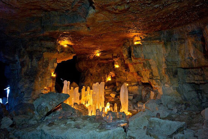 Многие слышали про старицкие пещеры, но не многие отважились туда сходить. Да и где они находятся тоже знают не все. Хотя в инете много подробной инфы. Это каменоломни. Много веков подряд тут добывали старицкий мрамор. Он шел на строительство даже московского кремля. И за многие годы образовались многие десятки километров подземелий. Ходят легенды, что знаменитая библиотека Ивана Грозного спрятана именно в наших старицких подземельях. Так ли это? Вряд ли мы узнаем, так как никаких серьезных исследований не велось, и не ведется. Зато можем любоваться красивым природным явлением - ледяные сталагмиты в ледяной пещере.