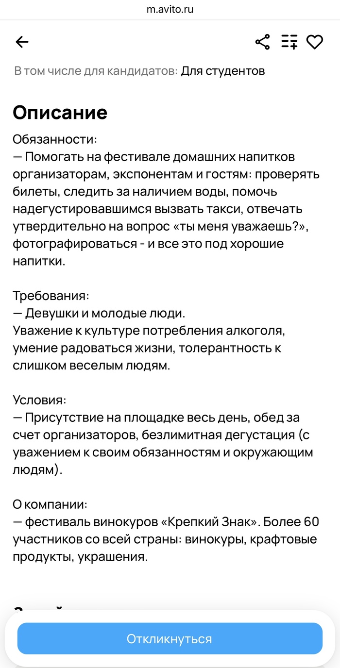 На Авито опубликовали вакансию, где предлагают гражданам, уважающим алкоголь, поработать на фестивале самогонщиков.
