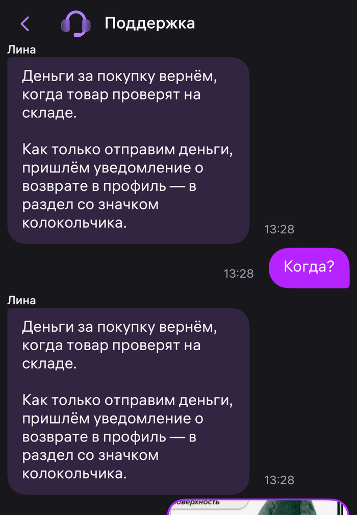 Начиная со второй недели писала в поддержку, но в ответ получала отписки и однотипные фразы, что заявка создана, что товар должен вернуться на склад, что продавец должен рассмотреть и теперь что «сроки рассмотрения заявки не регламентированы».