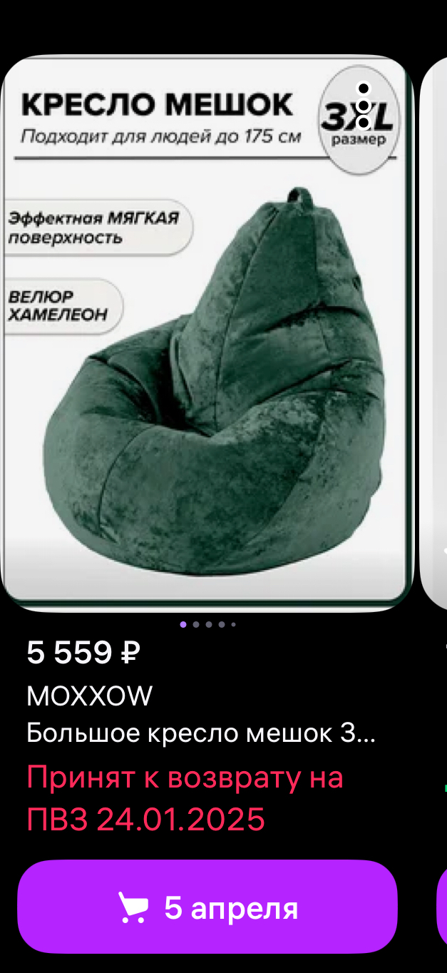 24.01.25 забрала товар, который не подошел по размеру (кресло оказалось маленьким). Вернула его на пвз в тот же день и заказала кресло побольше.