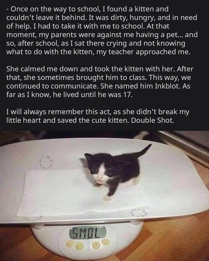Она успокоила меня и забрала котенка с собой. После этого она иногда приносила его в класс. Таким образом, мы продолжали общаться. Она назвала его Чернильная Клякса. Насколько я знаю, он дожил до 17 лет.