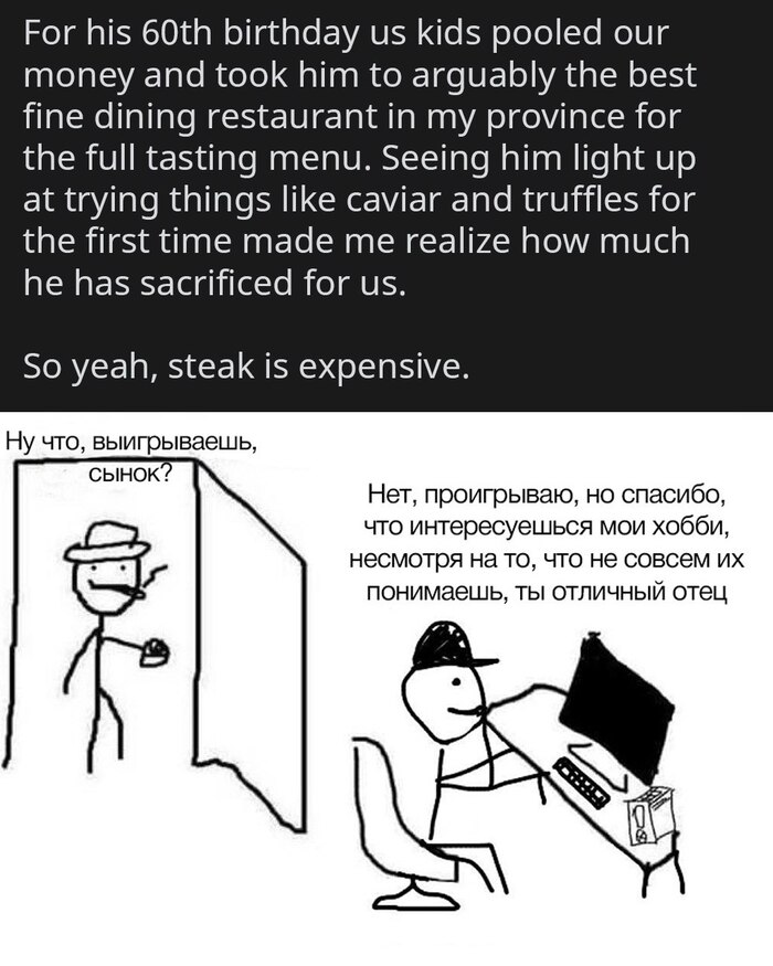 На его 60-летие мы, дети, скинулись и отвели его, пожалуй, в лучший ресторан изысканной кухни в моей провинции, чтобы попробовать меню полностью. Увидев, как он загорается, впервые попробовав такие блюда, как икра и трюфели, я понял, скольким он пожертвовал ради нас.