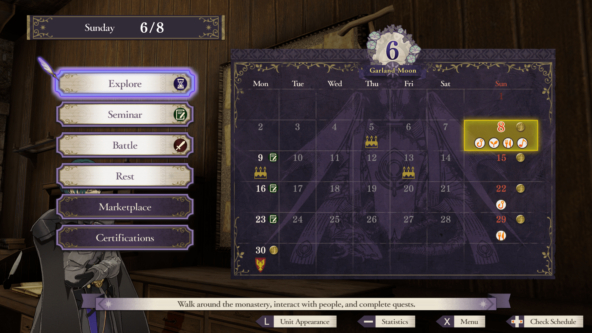 Основной упор в игре делается на сюжетное повествование, персонажей и на их взаимодействие, как между собой, так и между главным героем. Большую часть времени мы будем проводить в монастыре. Общаться с каждым вторым, выращивать рассаду, ловить рыбу, петь в хоре, ходить на свидания и обеды с импонирующими нам девочками. Также, так как главный герой является профессором в академии, то надо и свои прямые обязанности выполнять, а именно — проводить регулярные семинары, на которых развиваются таланты наших подопечных. Слишком сильно наседать на учеников не стоит, так как это это убьет в них весь энтузиазм и придётся проводить мероприятия, призванные вернуть в них азарт к учёбе. Самый банальный вариант — выделение им свободного от занятий дня.