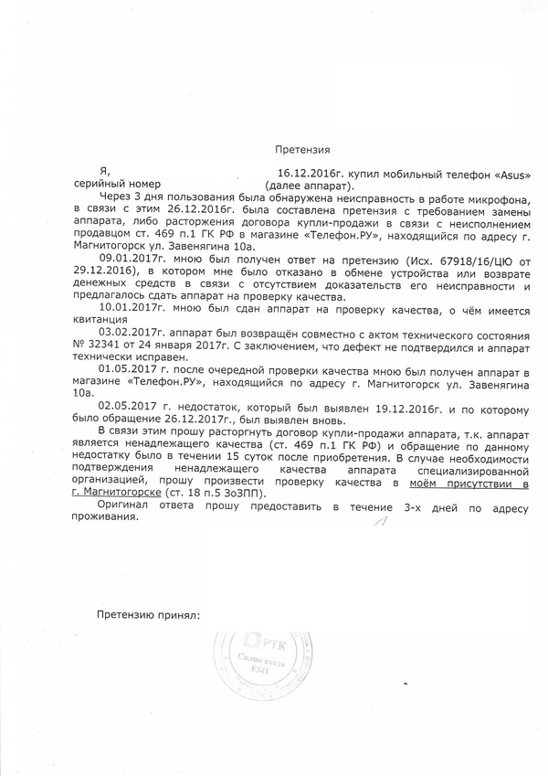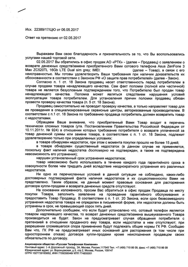Купил смартфон 16.12.16 в сети "Телефон.ру" (АО "РТК") через 3 дня после покупки обнаружилось следующая неполадка: через несколько нормально осуществлённых разговоров меня не слышно, точнее только первая фраза, затем "бульканье" и тишина, при включении громкой связи проблема исчезает. Последующие звонки проходят идентично. Проблема решалась перезагрузкой телефона, на через время снова появлялась. Мной 2 раза было сделано полных сброса телефона, были сделаны все рекомендуемые обновления ПО, однако проблема возвращалась. Я позвонил в колл-центр "АСУС" и объяснил проблему, в ответ мне предложили "ждать обновления ПО". Через 10 дней 26.12.16 обратился в магазин где покупал смартфон, мне предложили написать претензию и сдать телефон на проверку качества(20 дней). Претензию написал, телефон сдавать отказался. 10.01.17 мне сообщили, что пришел ответ на претензию. В ответе написано, что я смогу поменять телефон только после экспертизы, которая докажет, что он неисправен. Я сдал телефон на проверку качества. 02.02.17 мне его вернули с ответом: "на момент проверки заявленный дефект не подтвердился". Через 2 дня пользования неисправность повторилась, также был обнаружен дефект гнезда наушников-при подключении наушников "терялся" контакт (были опробованы 2 пары наушников, которые нормально работают на других устройствах в том числе ASUS Zenfone 2 ze550kl. 04.02.17 мною снова была написана претензия и сдан телефон на проверку качества. 14.02.17 пришел ответ на претензию со стандартной отпиской, 19.02.17 вернули телефон с заключением, что всё исправно. Для демонстрации того, что телефон работает продавец-консультант включил телефон, после выбора языка и с согласием на условия пользования, запросил телефон или е-маил для входа в аккаунт. После ввода электронного гугл адреса и пароля (которым я пользовался на этом телефоне изначально) мне вышло сообщение: "Войдите в один из аккаунтов владельцев этого устройства". На данный момент у меня нерабочий телефон.