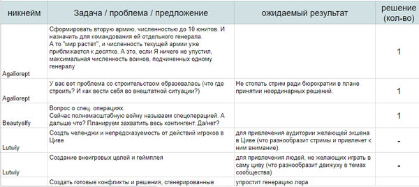Человек, отсутствовавший некоторое время сможет быстро включиться в игру, посмотрев что мы уже решили и что нам требуется и предложить свою идею по решению поставленных задач. Не шоркаясь по форуму и перебирая мегабайты текста.