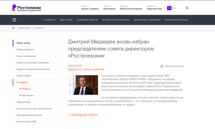Это Ростелеком. А кто там председатель совета директоров интересно? Очень опасный человек. Его сейчас оставили за главного у красной кнопки. Разумеется это наш слоняра.