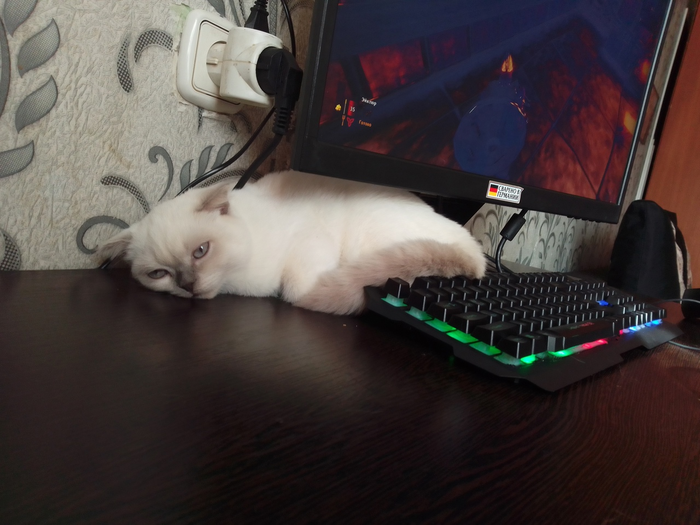 Февраль 2021. Облюбовала место под моим монитором для сна: