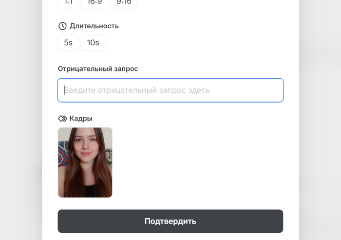 Можно загрузить фото и описать, что должно происходить (движение, эмоция, ракурс).