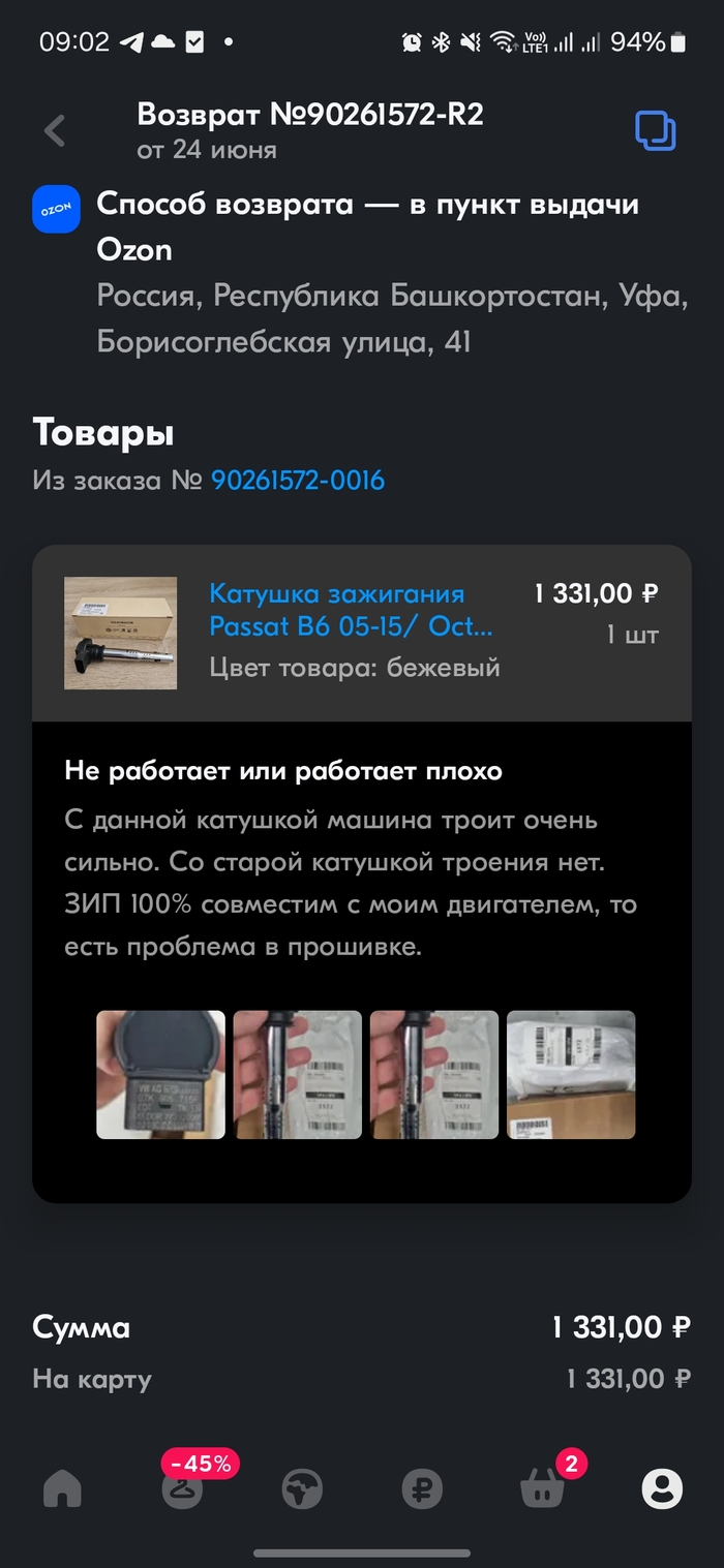 21.06 же устанавливаю, запускаю машину, если раньше была детонация двигателя на холостых, которая при прогреве никак не проявлялась и при простом повышении оборотов исчезала, то с этой катушкой мотор и при прогреве, и на холостых, и при поднятии оборотов хоть на какое значение хочет выскочить из подкапотного пространства и уйти в ближайший сервис на ремонт. Ставлю родную катушку обратно, становится как раньше, что значит, значит катушка неисправна. (Катушка по номеру с оригинальной сходится, то есть не подходить она не может на этот мотор). Создаю заявку на возврат 24.06 так как выходные были заняты, оформлял возврат на озон только один раз, опыта нет, как описал так описал, в конце написал ещё вместо "катушка" - "прошивка". Товарищ продавец в конце следующего дня отклоняет заявку на возврат, может где-то и приложил объяснения почему, я не нашел.