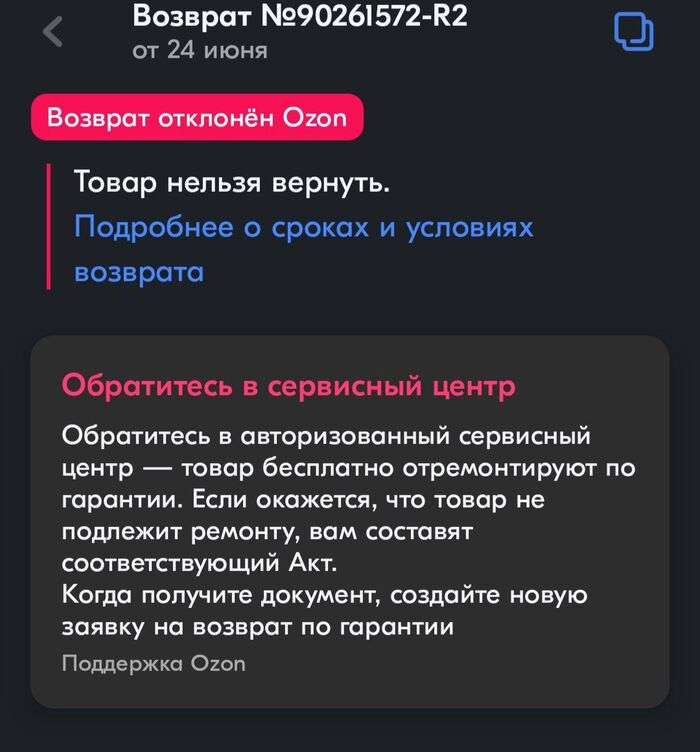 Создаю спор вечером того же дня, который отклоняет уже ОЗОН 26.06 с рекомендацией обратиться в авторизованный сервисный центр.