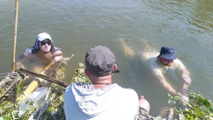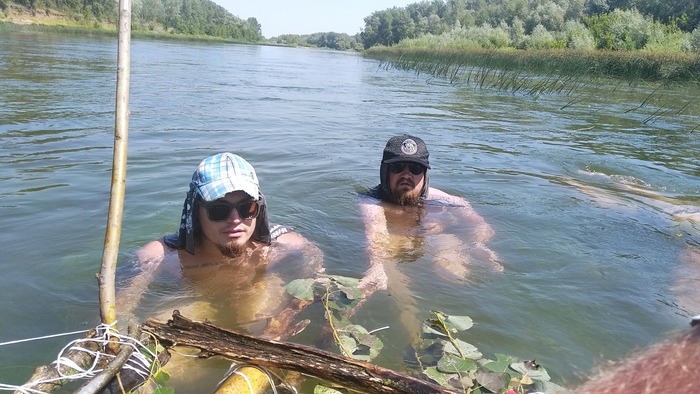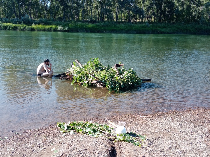 В тот день, мы укрепил плот, потому что верёвки подразвязались. Сделали внушительную конструкцию которая способна была выдержать почти всех включая рюкзаки. Попотели, знатно над этим плотом за все время.